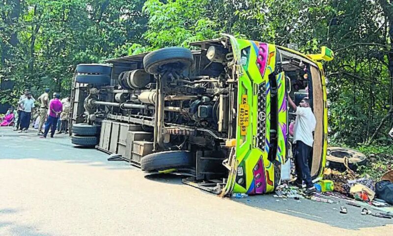 ಧರ್ಮಸ್ಥಳದಿಂದ ದರ್ಶನ ಮುಗಿಸಿ ತೆರಳುತ್ತಿದ್ದ ಆಂಧ್ರ ಮೂಲದ ಭಕ್ತರಿದ್ದ ಖಾಸಗಿ ಬಸ್, ಉಜಿರೆಯಿಂದ ಕೊಟ್ಟಿಗೆಹಾರದ ಕಡೆ ಹೊರಟಿದ್ದ ವೇಳೆ ಚಾರ್ಮಾಡಿ ಘಾಟಿಯ ಮೂರನೇ ತಿರುವಿನಲ್ಲಿ ಚಾಲಕನ ನಿಯಂತ್ರಣ ತಪ್ಪಿ ಉರುಳಿ ಬಿದ್ದಿದೆ.